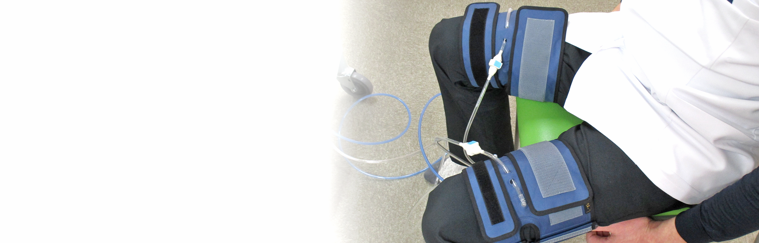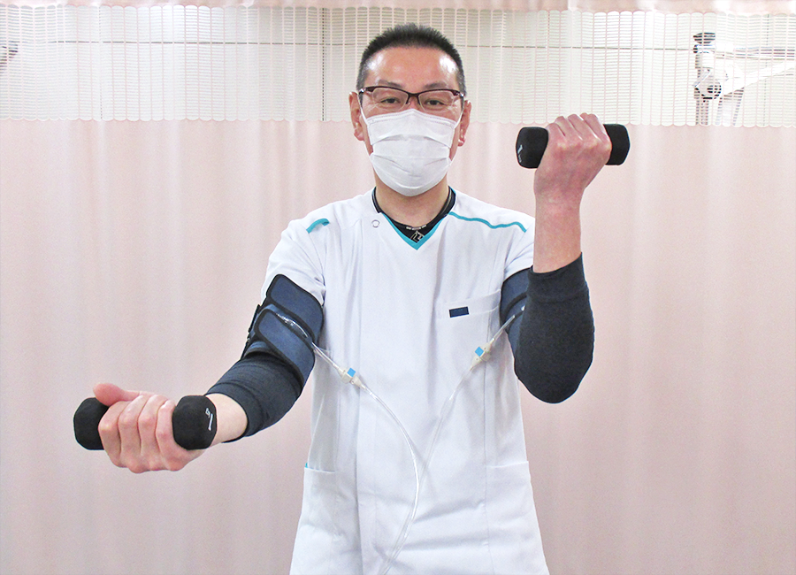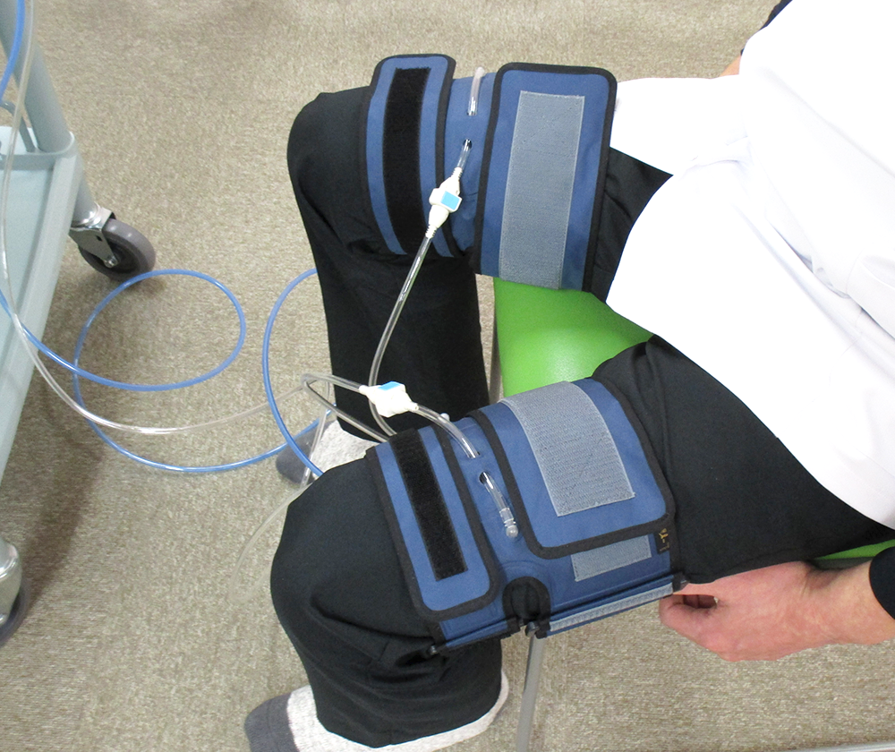 椅子に座ったままの状態で太もも若しくは腕にバンドを巻き付けて血流の制限と開放を行います。治療時間は1回約7分です。1週間に2回の治療を1か月続けると様々な効果が期待できます。